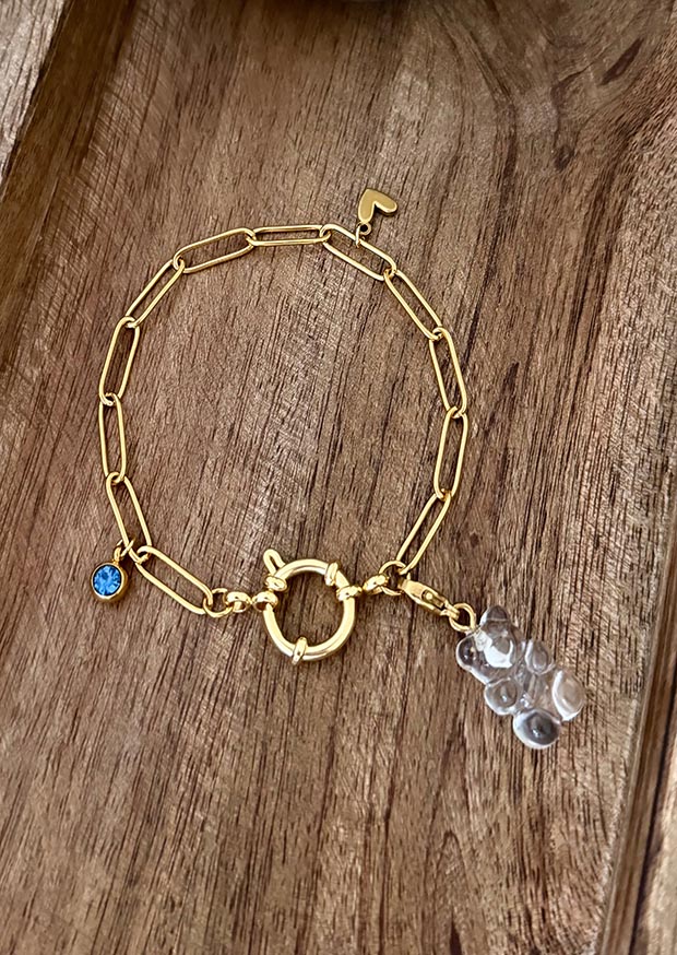 Naprosto originální roztomilý náramek s medvídkem, srdíčkem a modrým kamínkem v barvě zlata.