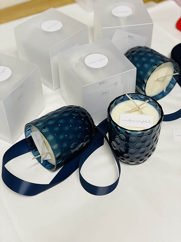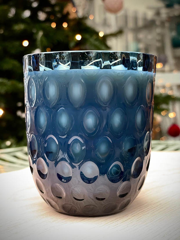 Přírodní svíčka/miska v kouřově modrém křišťálu “Puntík”