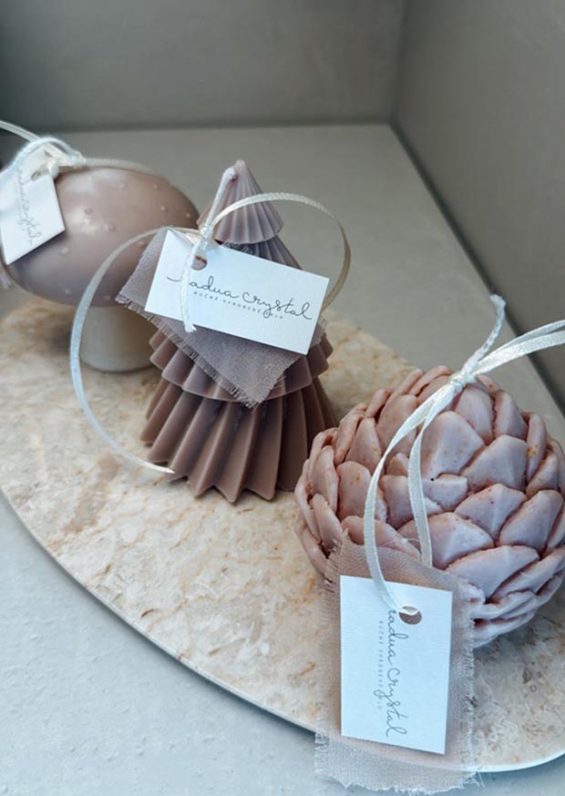 Řemeslná ručně vyráběná svíčka ve tvaru šišky.