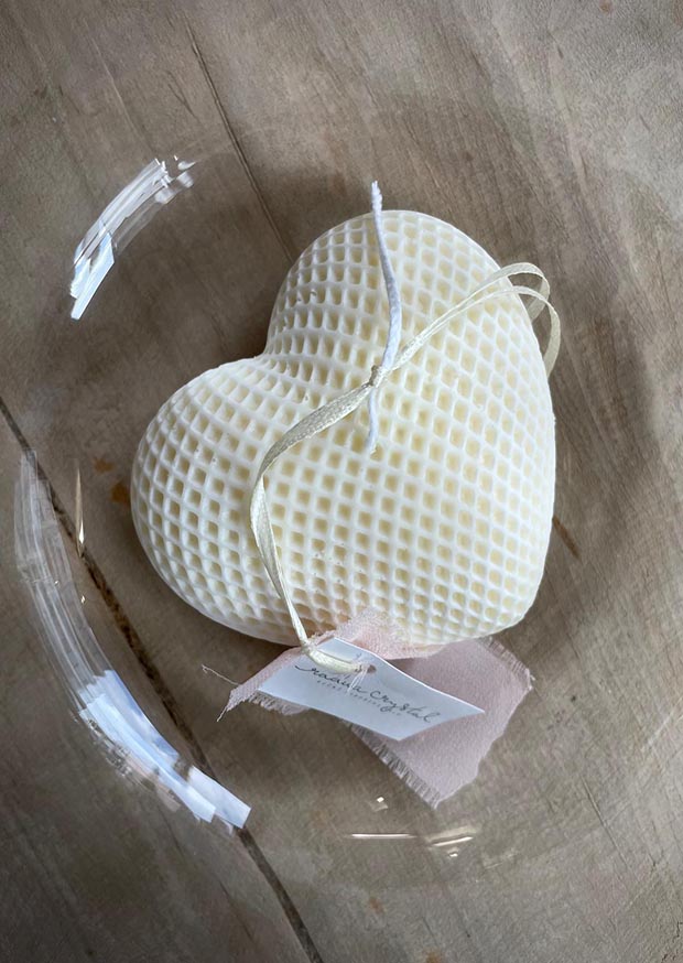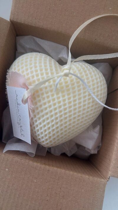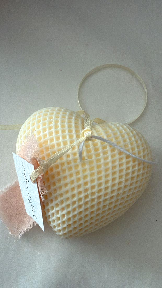 Řemeslná ručně vyráběná svíčka ve tvaru srdíčka.