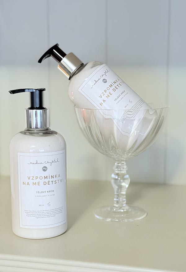 Představuji vám luxusní tělové mléko v jemné krémové konzistenci s mou nejmilejší vůní Vzpomínky na mé dětství, které vás omámí esencemi z ručně sbíraných poupat růže damašské a růžovým pepřem zahalenými do speciální vůně, která je mým osobním tajemstvím.